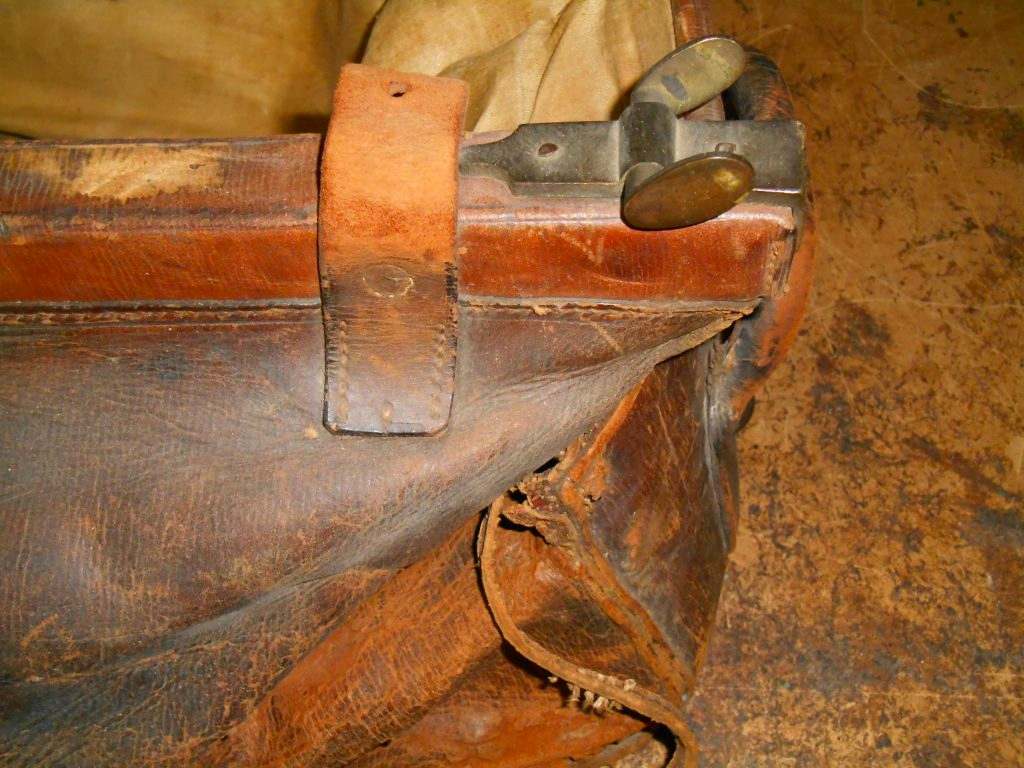 121 years after the bag was made, it came into my world to be restored. Careful work was applied to slowly rehydrate the leather, damage to some of the top grain was attended to. Stitching was replaced, by hand saddle stitching. Sympathetic recolouring was touched in on damaged parts. Then finishes applied to protect the leather.
